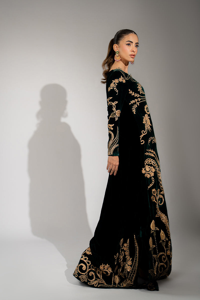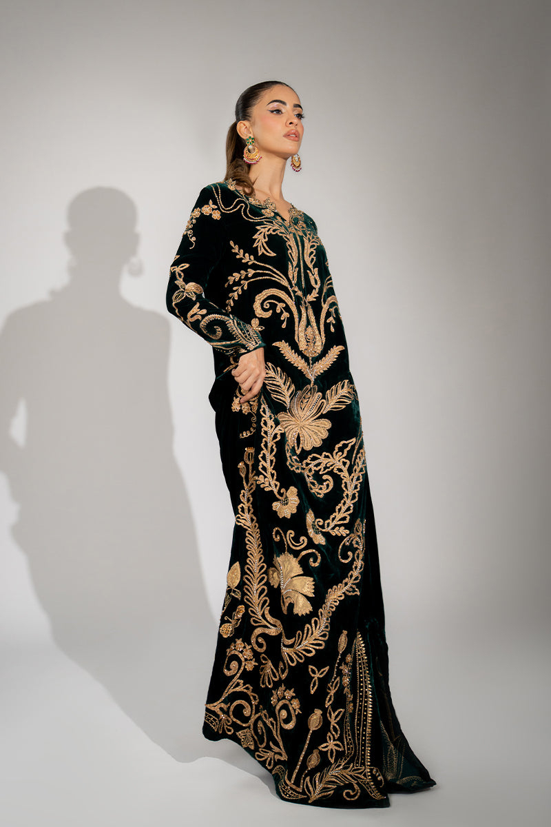 Presenting the pinnacle of opulent grandeur, this floor-length emerald green velvet gown is a true heirloom piece from our couture collection. The rich, deep velvet is entirely blanketed in intricate antique gold tilla and zari embroidery, featuring a mesmerizing baroque and floral design that flows seamlessly from the neckline to the hem. This majestic silhouette is a commanding statement of traditional luxury and redefined elegance, ensuring you captivate the room at any black-tie or wedding event.